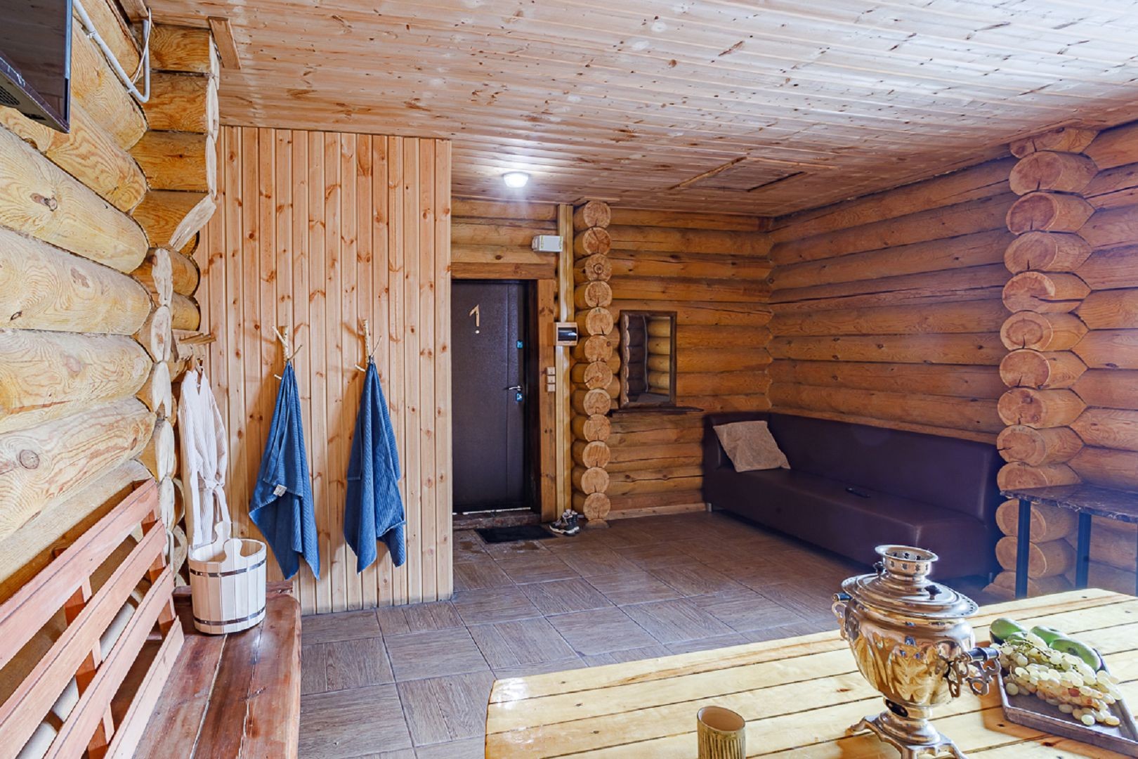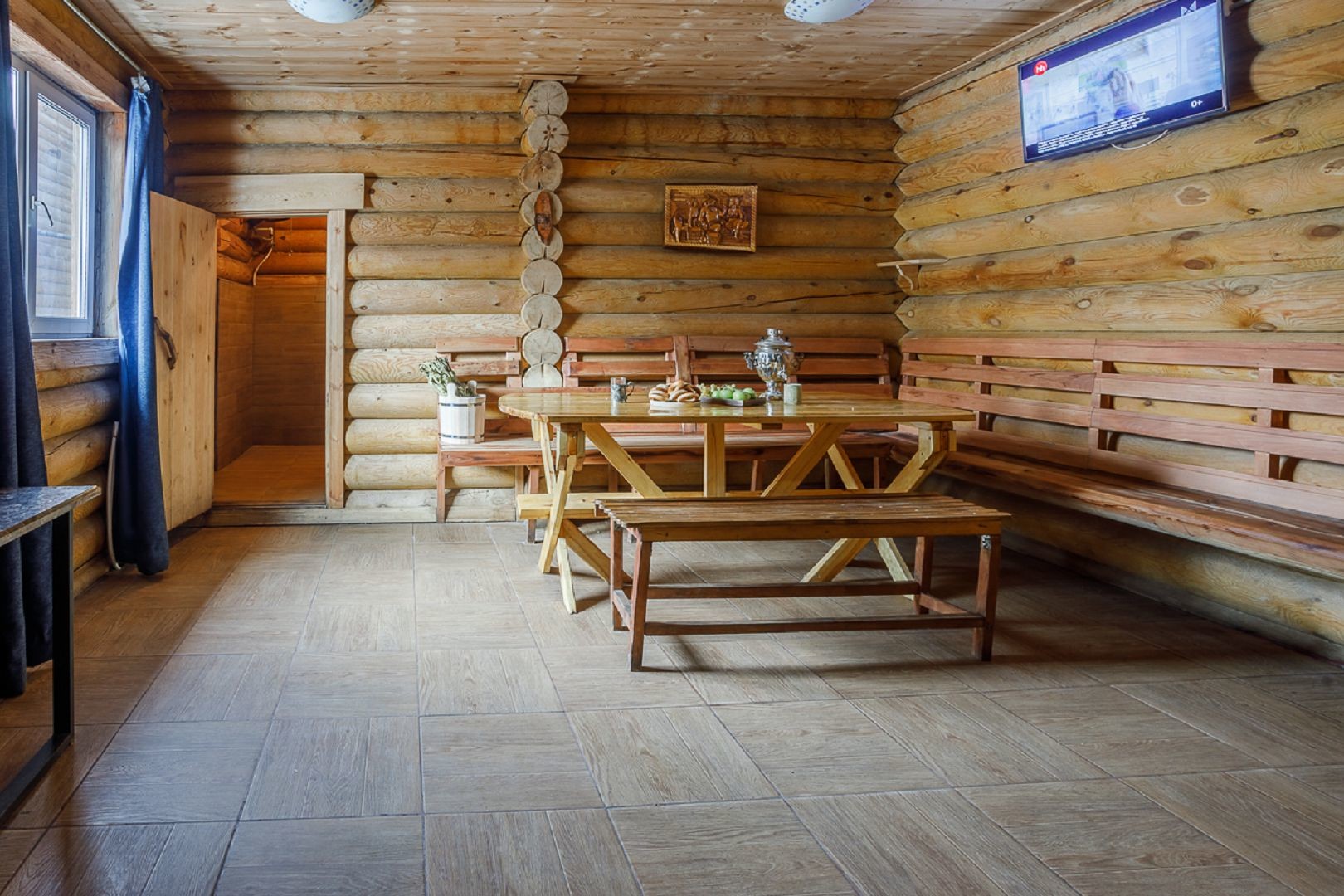 Банный комплекс с удобной парковкой полностью сделан из сруба натурального дерева, поэтому у вас сложится впечатление будто вы находитесь в настоящем Русском Банном подворье. Он включает в себя четыре русские парные на дровах вместимостью до 12 и до 16 человек, душевые с обливными ведрами для водных процедур, санузел, две уютных комнаты отдыха с удобной кроватью, где можно расслабиться и даже немного вздремнуть, а также просторную гостиную для посиделок с компанией.